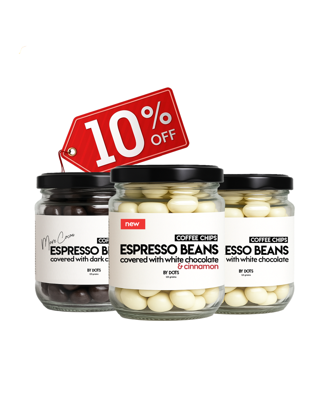 Save 10% on three 125g jars of our finely roasted espresso beans coated in chocolate, available in different flavors
